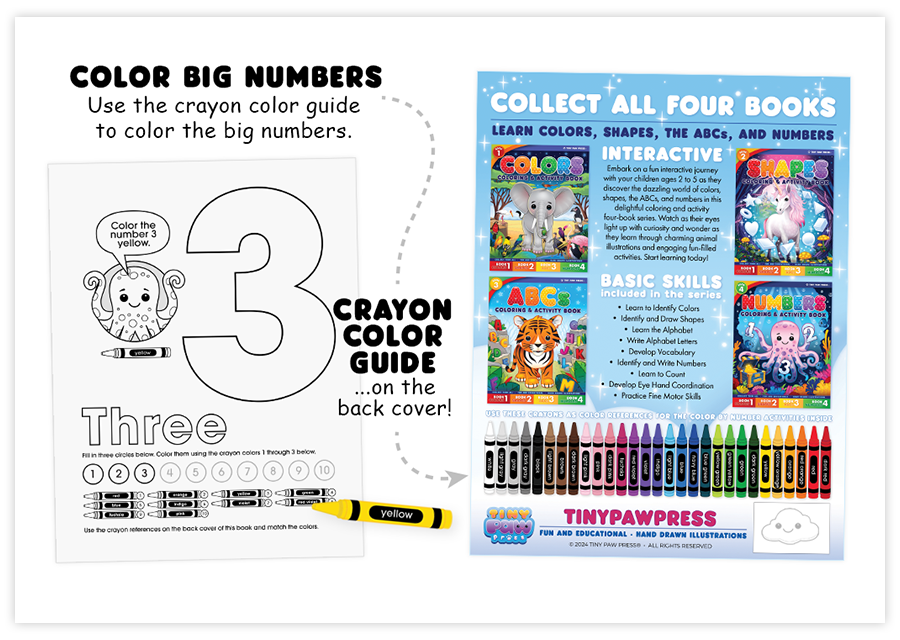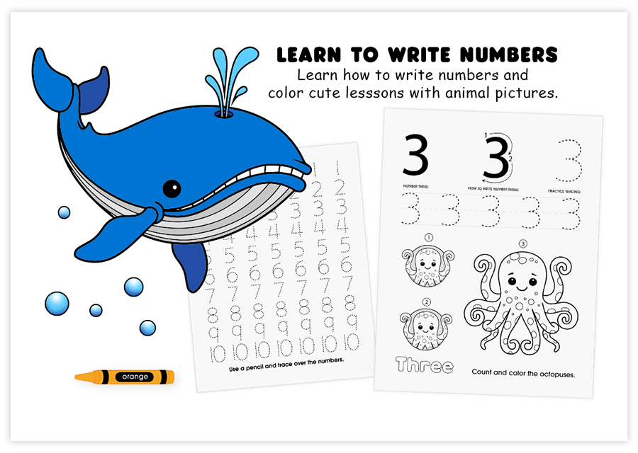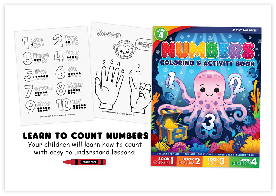 • introduction to numbers and counting • identify and write numbers • learn to count numbers with lessons including cute animals • learn to count with your fingers • count and color large print numbers • learn to write numbers by tracing numbers, various counting lessons with different number diagrams • a fun number and shapes matching activity • plus four video tutorials that will guide your children step-by-step through coloring pages and activities •