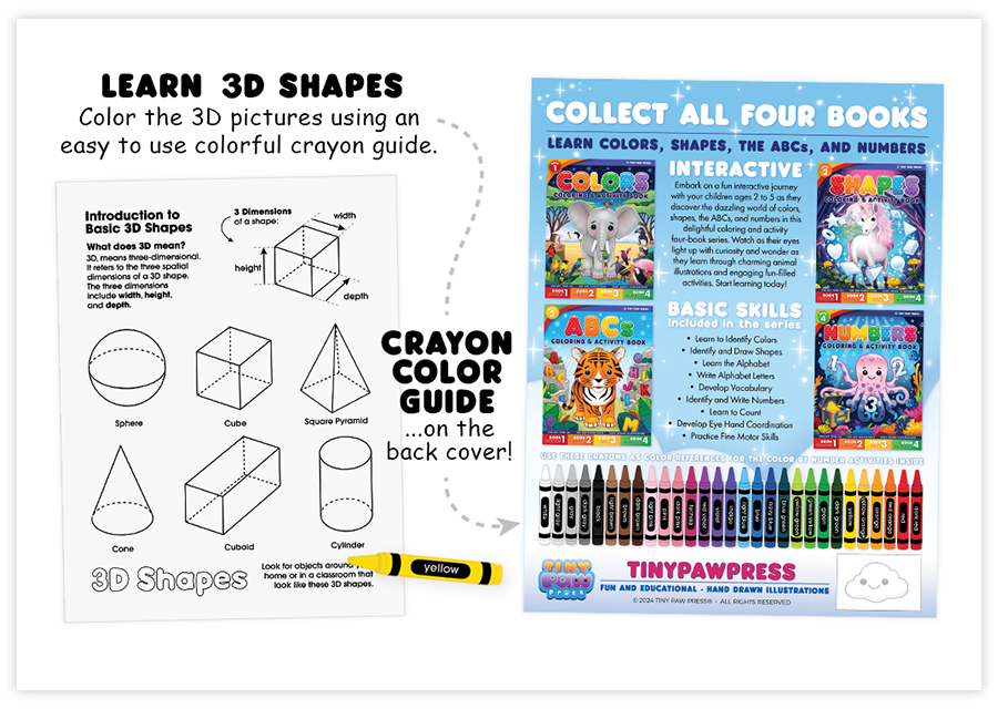 Introduction to basic shapes including circles • squares, rectangles, triangles, ellipses, diamonds, pentagons, hexagons, octagons, semi-circles, trapezoids, parallelograms, crescents, stars, hearts, and ovals • learn the difference between the basic and advanced geometrical shapes • learning to identify different kinds of shapes in cute animal lessons • introduction to 3D (dimensional) basic shapes • plus four video tutorials will guide your children step-by-step through coloring pages and activities.